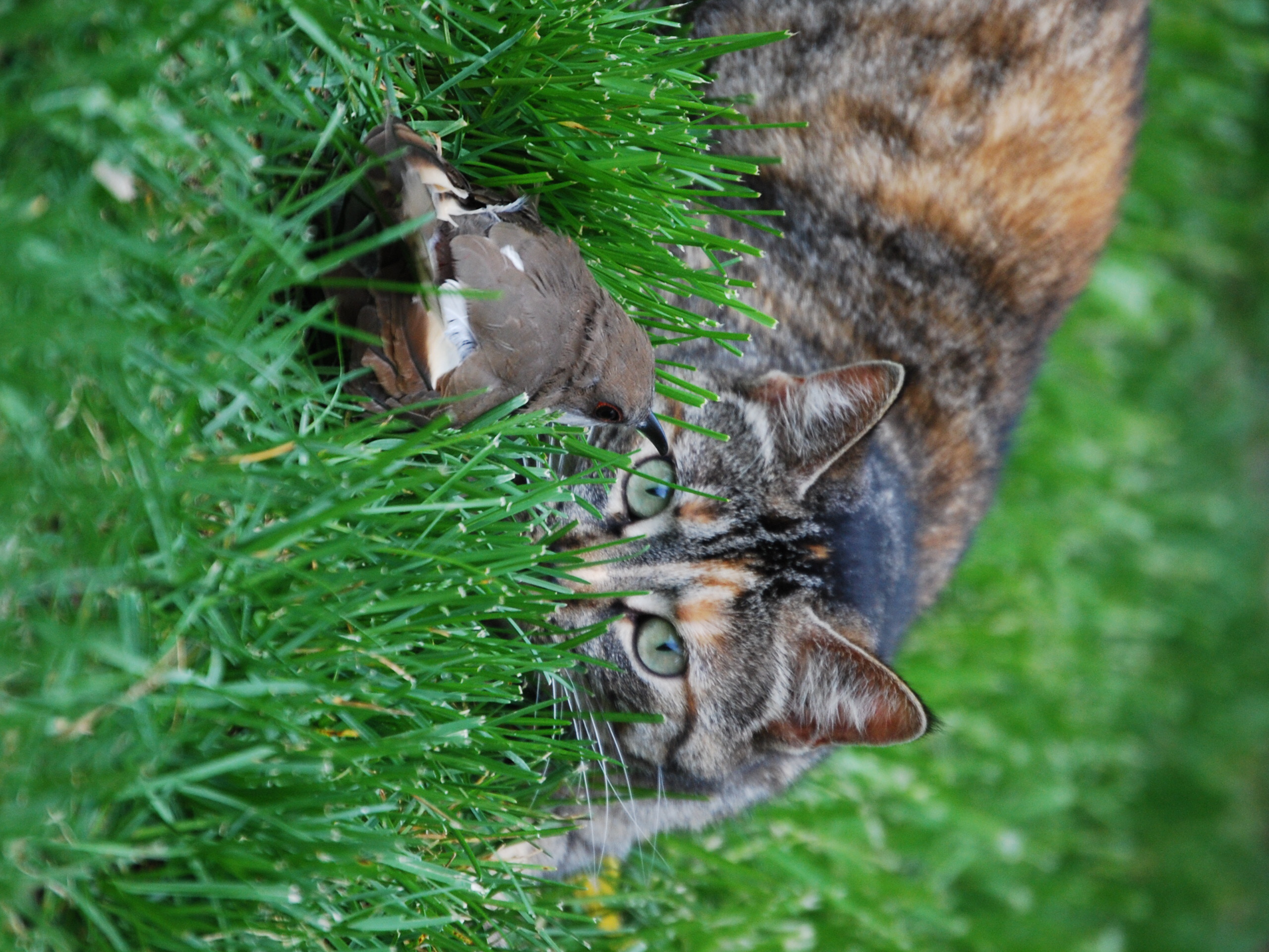 In May of this year, I photographed our cat, Twila, stalking a bird in our yard. Although Twila is a great “mouser,” she tends to be gentle with birds. She plays with them (similar to the way she plays with spiders), and then lets them go. This bird was no exception. Thirty minutes after I took the photo, I saw the bird perched in a nearby tree. No longer interested in playing with the bird, Twila moved on to stalking bigger and better things, including a squirrel. But unlike the birds, squirrels in our neighborhood refuse to play with her. She gets the same response from the raccoons.