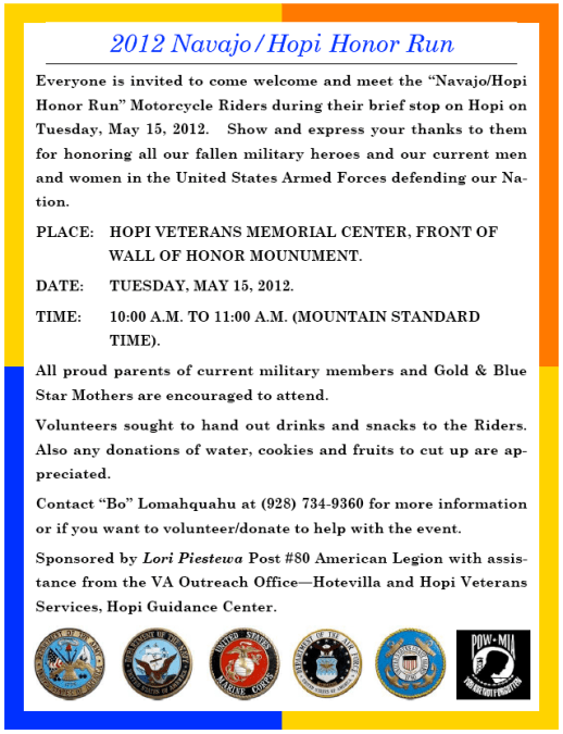 10TH ANNUAL NAVAJO-HOPI HONOR RUN            MAY 15, 16, & 17, 2012