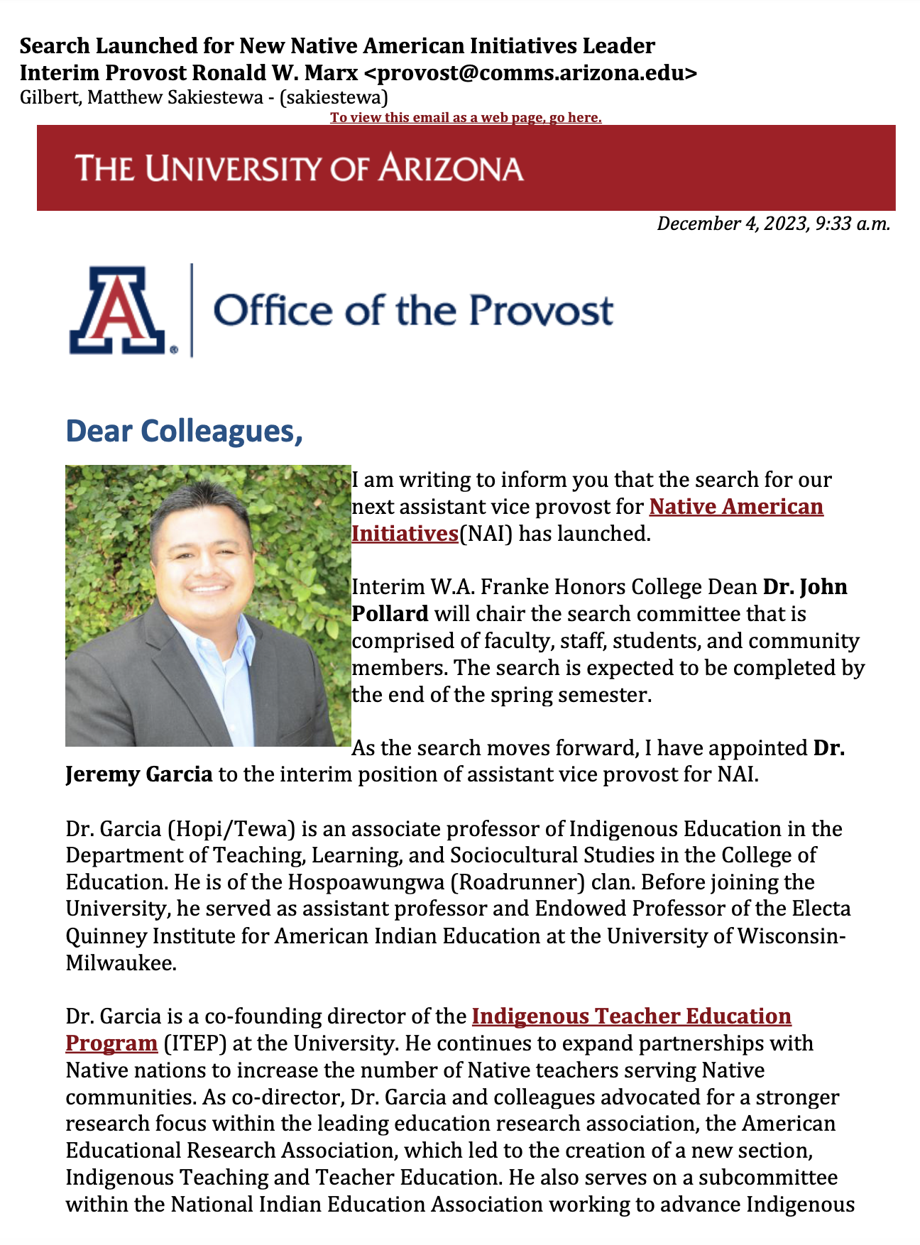 When I was ten years old, my father, Willard Sakiestewa Gilbert (who is here today), accepted a faculty position in the College of Education as an Assistant Professor of Curriculum and Instruction. He remained at NAU for 32 years, retiring in 2019 at the age of 67.
