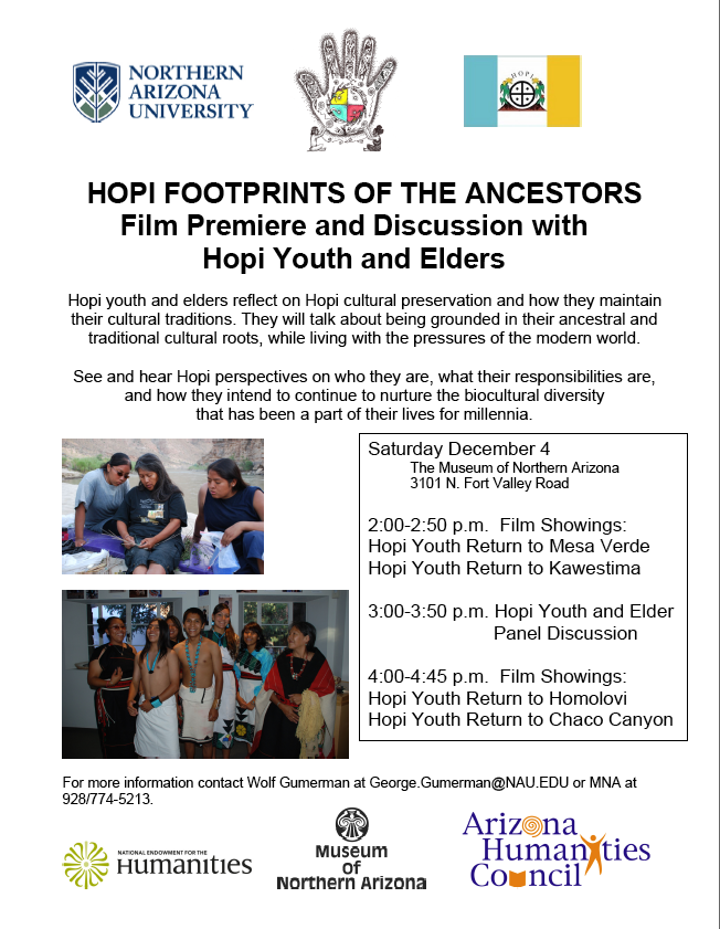 A few weeks ago I passed along an announcement on my blog about 4 Hopi film screenings at the Museum of Northern Arizona. One of these films was Hopi Youth Return to Mesa Verde. This film examines a group of Hopis who traveled to a Hopi migration settlement called Mesa Verde in Colorado. As you watch the film, take note of the similarities that the youth bring up between Hopi ancestral ways and the practices of today’s Hopi people. Their remarks on the continuity of Hopi culture is an important theme in the film.