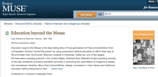 I am pleased to announce that Education beyond the Mesas: Hopi Students at Sherman Institute, 1902-1929 (University of Nebraska Press, 2010) is temporarily available for free download through Project MUSE.